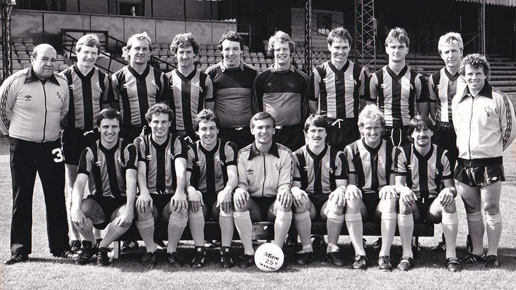 Back row L to R: Norrie Grey (Physio), Hugh McCann, Peter Davidson, Tony O'Hara, Kevin Baldwin, Mark Glynn, Peter Robinson, Stuart Romaines, Dave Steedman, Ian Smith.