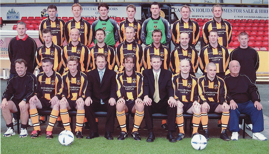 Front row L to R: Ian Smith (physio), Jamie Birrell, John McAllister, Paul Smith (manger), Alan Neill (captain), Greg Shaw (asst. manager),