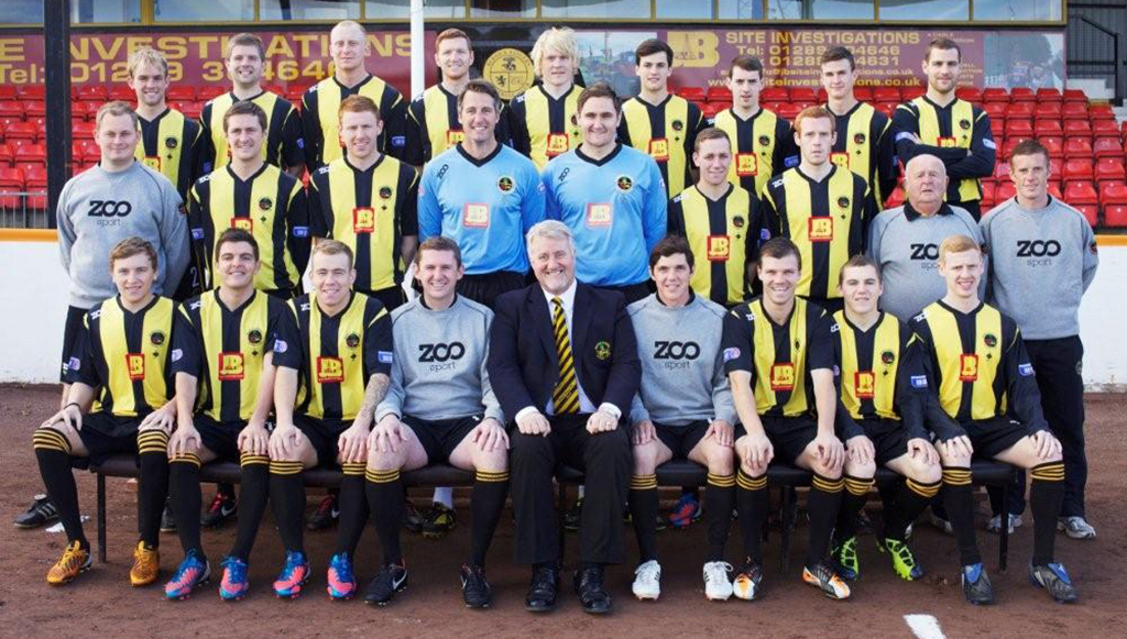 Front row L to R: Phil Addison, Kevin McDonald, Lee Currie, Robbie Horn (Assistant Manager) Brian Porteous (Chairman), Ian Little (Manager),